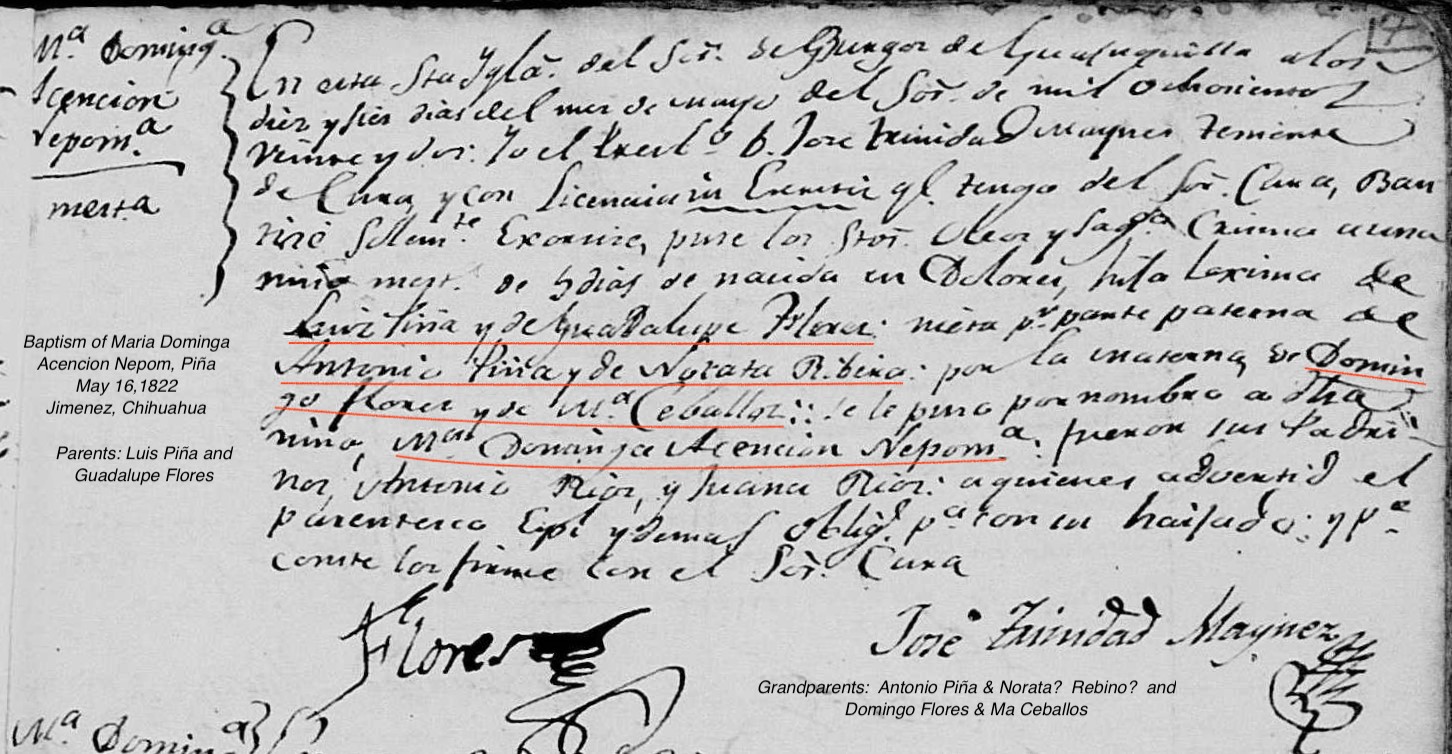 Maria Dominga Ascencion Nepoma PIÑA FLORES Baptism: May 16, 1822 33 — Santo Cristo de Burgos, Jiménez, Chihuahua, Mexico |