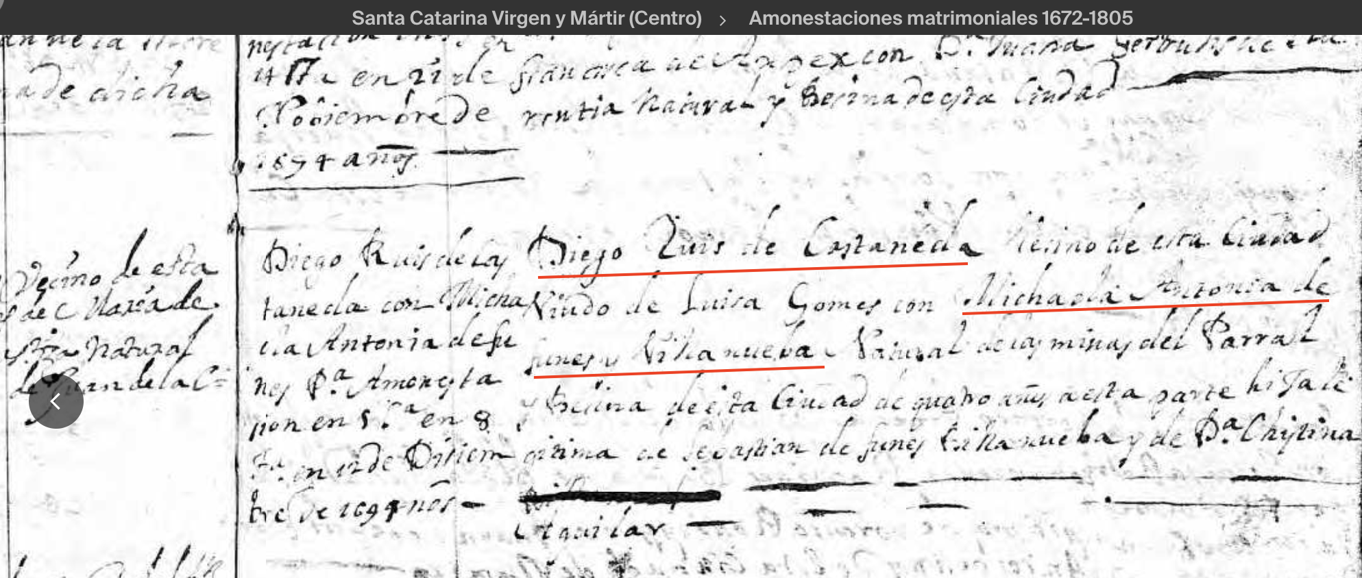 | Note | Name: Sebastian De Funes Y Villanueba Sex: Male Wife: Christina De Aguilera Y Castillo Daughter: Michaela Antonia De Funes Y Villanueba from Mexico Marriages Name: Diego Ruis De Castaneda Spouse's Name: Michaela Antonia De Funes Y Villanueba Spouse's Birthplace: Parral Event Date: 11 Dec 1694 Event Place: Santa Veracruz, Santa Veracruz, Distrito Federal, Mexico Spouse's Father's Name: Sebastian De Funes Y Villanueba Spouse's Mother's Name: Christina De Aguilera Y Castillo |