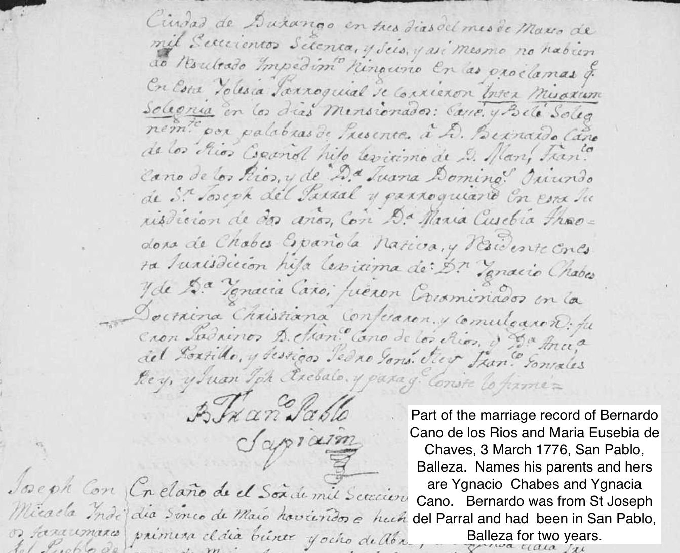 | Baptism | Mexico, Select Baptisms, 1560-1950 For Joseph Manuel Bernardo Cano Domingues Gender: Male Baptism Date: 6 sep. 1755 Baptism Place: San Jose,Hidalgo Del Parral,Chihuahua,Mexico Father: Manuel Cano De Los Rios Mother: Juana Domingues FHL Film Number: 162531 He declared in marriage records of 1776 and 1777 that he was born in Parral. |