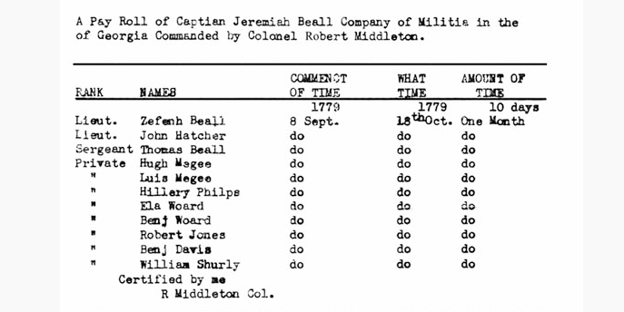 Military | 1779 Note: Pay Roll of Capt Jeremiah Beall’s company of militia from Richmond County, Georgia, for the period 8 Sept 1779-18 Oct 1779, included Hugh “Megee” and “Luis Megee” (Davis, “Georgia Citizens and Soldiers of the American Revolution,” 92). This company was part of the “Lower Battalion,” covering the southern sections of Richmond County, commanded by Col Robert Middleton. Middleton and his men appear to have joined Gen McIntosh in his march from Augusta to aid the French Admiral d’Estaing’s assault on British occupied Savannah in September-October 1779. The assault was unsuccessful and French and American troops withdrew on 18 Oct 1779 (Coleman, “The American Revolution in Georgia,” 128-9).
