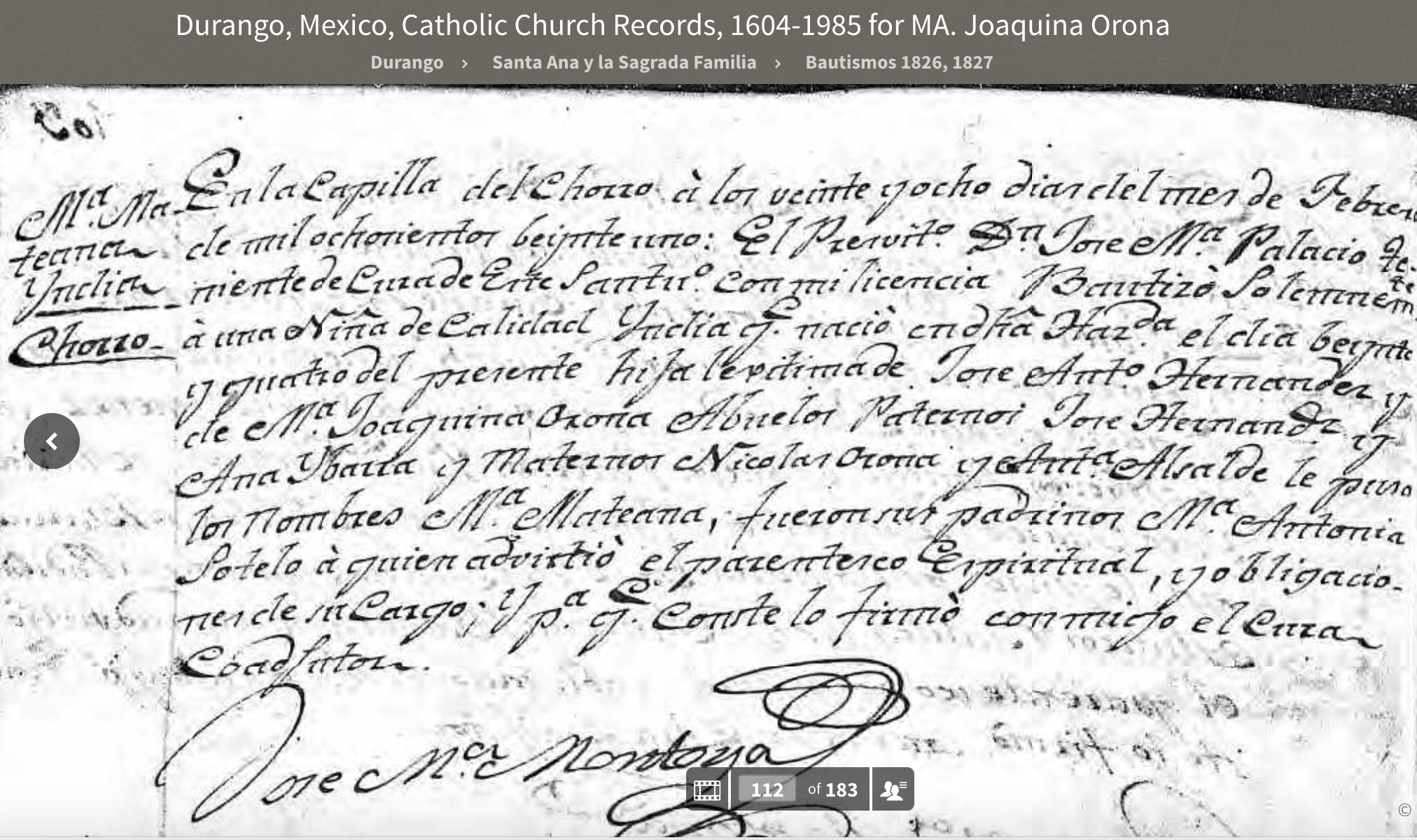 | Baptism | Mexico, Select Baptisms, 1560-1950 For MA. Josefa Andrea Hernandes Orona Gender: Female Baptism Age: 0 Birth Date: 26 nov. 1816 Baptism Date: 30 nov. 1816 Baptism Place: Santuario DE Nuestra Senora DE Guadalupe,Victoria DE Durango,Durango,Mexico Father: Jose Anto. Hernandes Mother: Joaquina Orona FHL Film Number: 654752 |