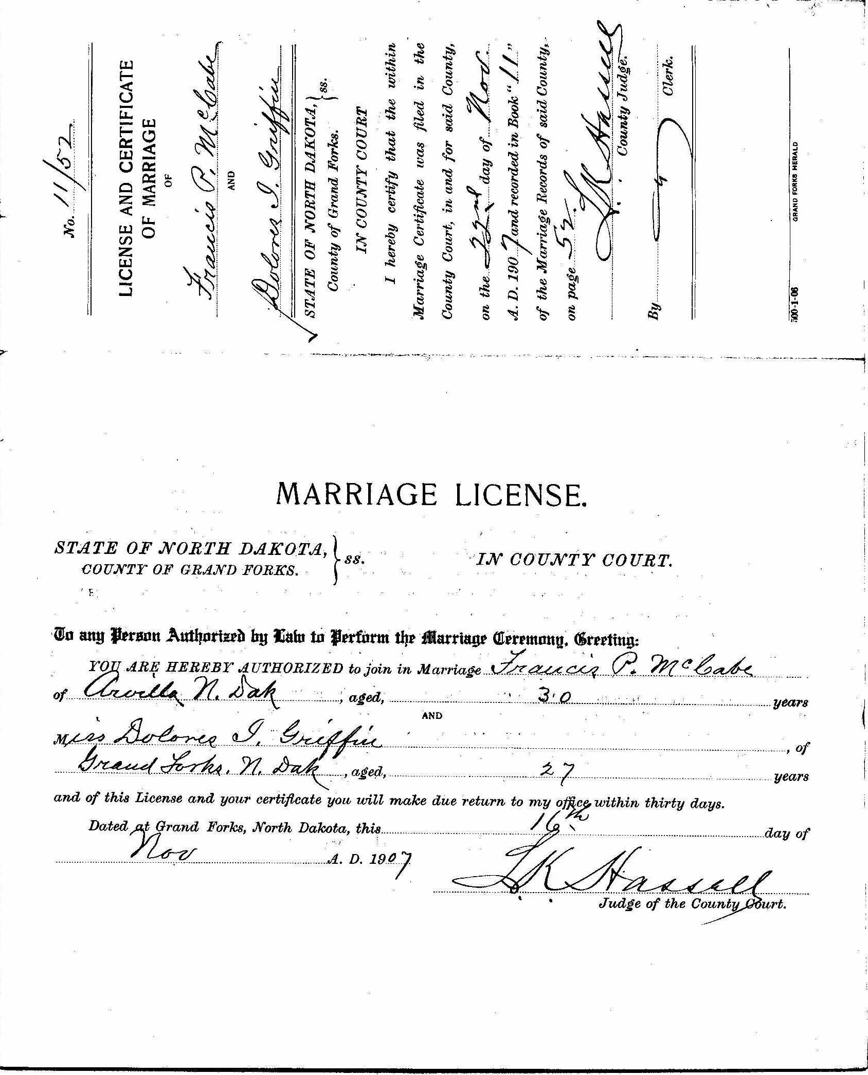 Marriage License for Frank McCabe & Dolores Griffin, 1907