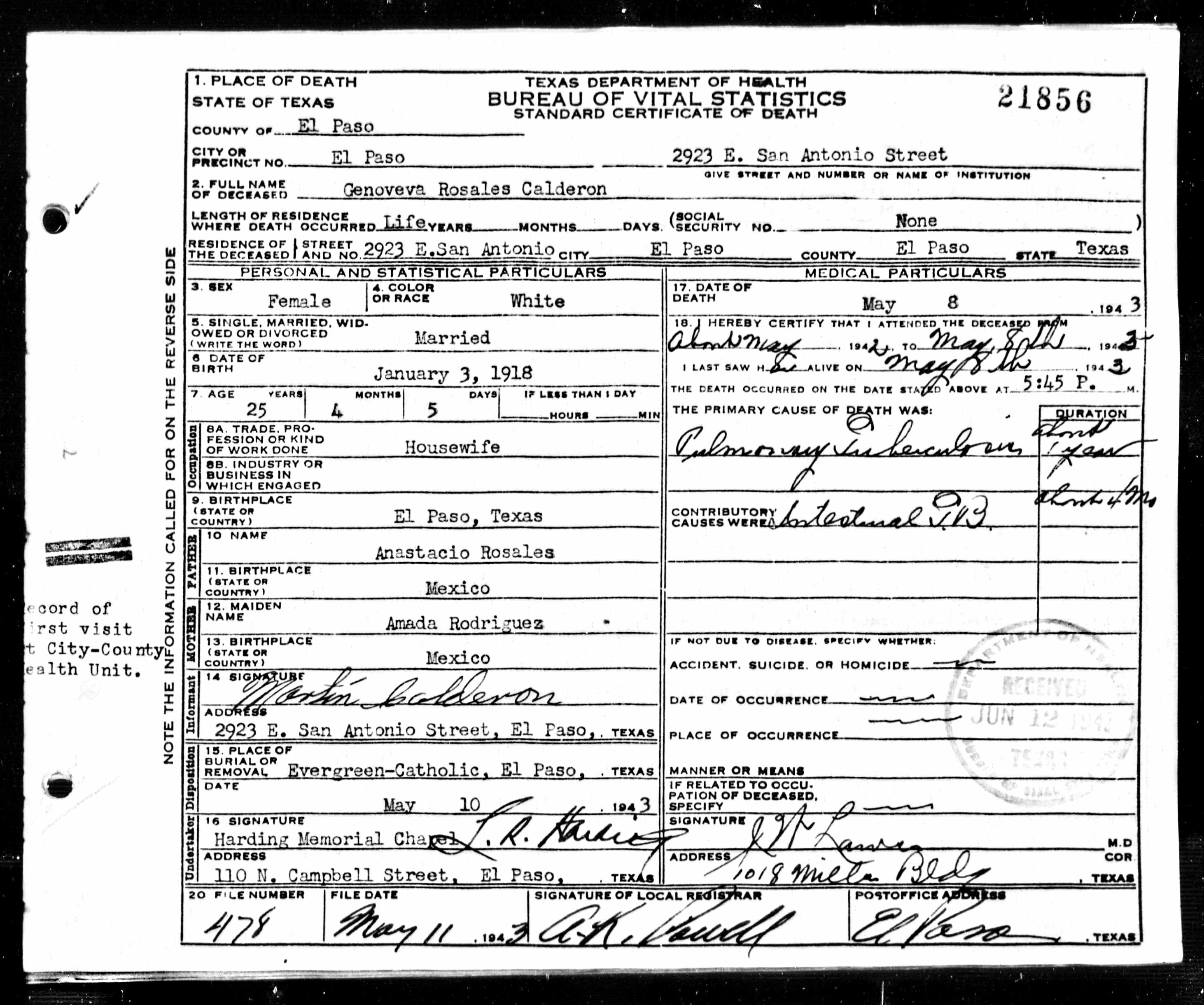 | Genoveva ROSALES Genoveva Calderon | January 3, 1918 | 108 | El Paso, Tx | 0 | May 8, 1943 | 82 | 25 | El Paso, Tx | September 4, 2018 - 2:13:17 p.m. | F | YES | Y100 | ||||
