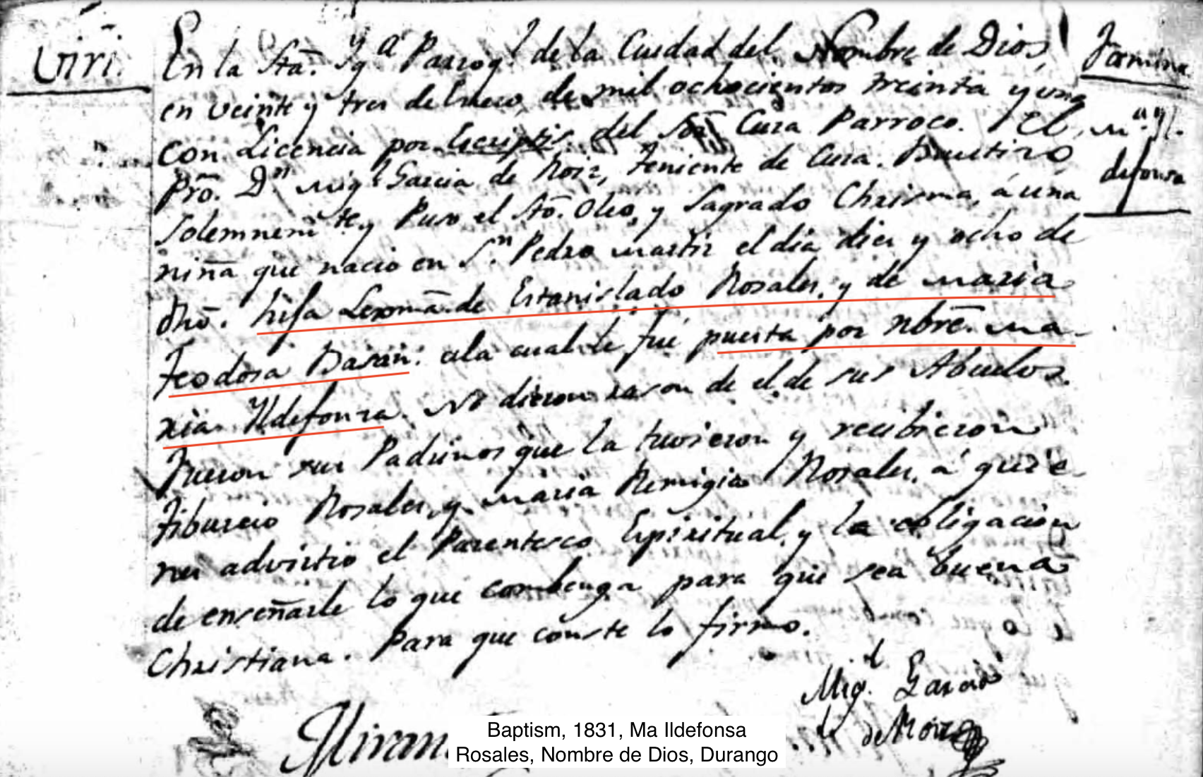 Baptism of Maria Ildefonsa, Daughter of Estanislado Rosales, 1831, Nombre de Dios, Durango