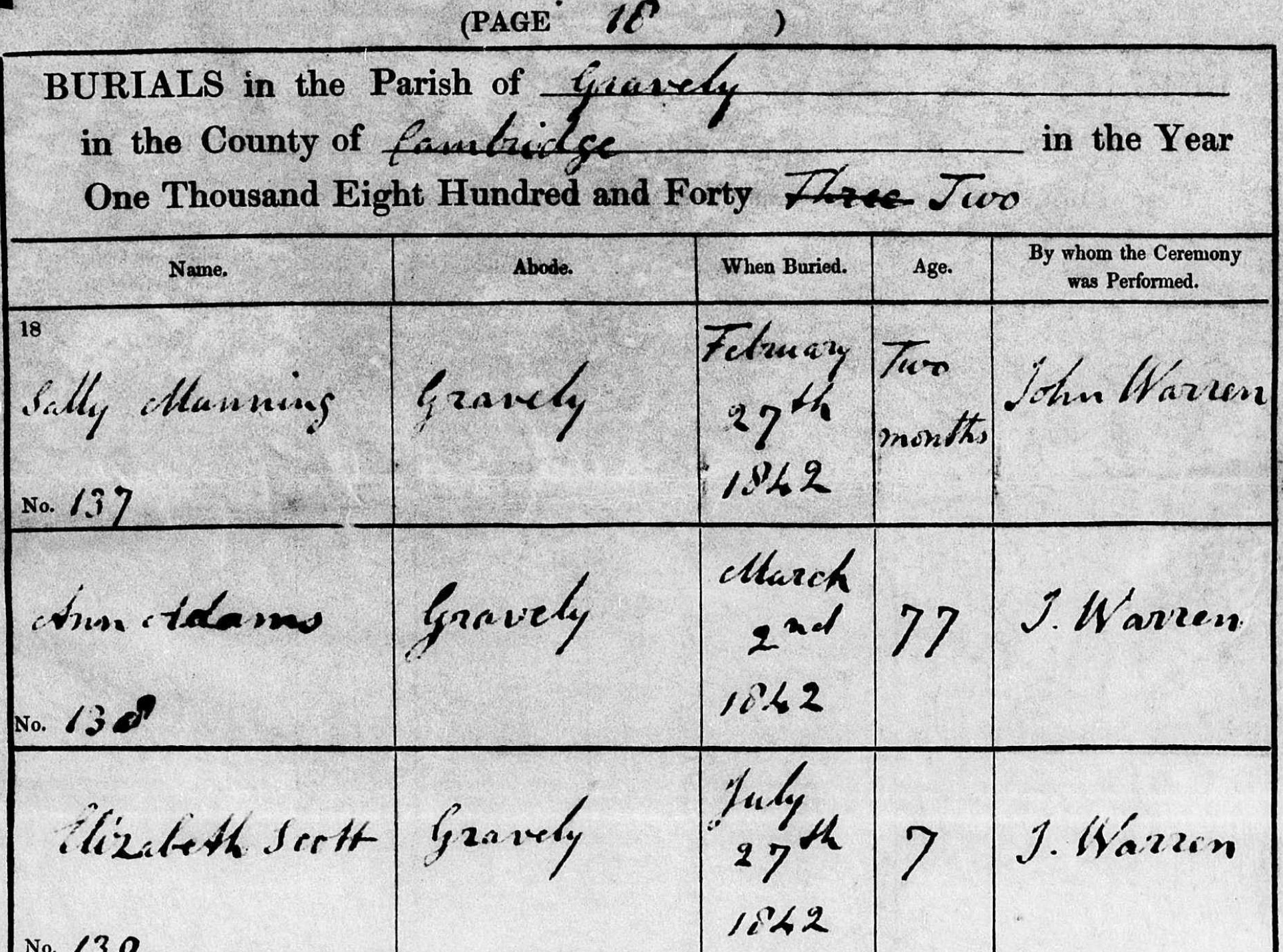 | Elizabeth SCOTT | November 13, 1834 | 191 | Graveley | 0 | July 27, 1842 | 183 | 7 | Graveley, Cambridgeshire, England | August 20, 2021 - 8:17:17 p.m. | F | YES | YES | ||||