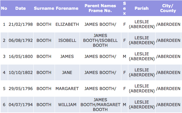 | James of Drumgowan BOOTH | 43 | Isabel BOOTH | 28 | about 1791 | 235 | 7 | August 18, 2013 - 6:44:08 p.m. | YES | Y | ||||||