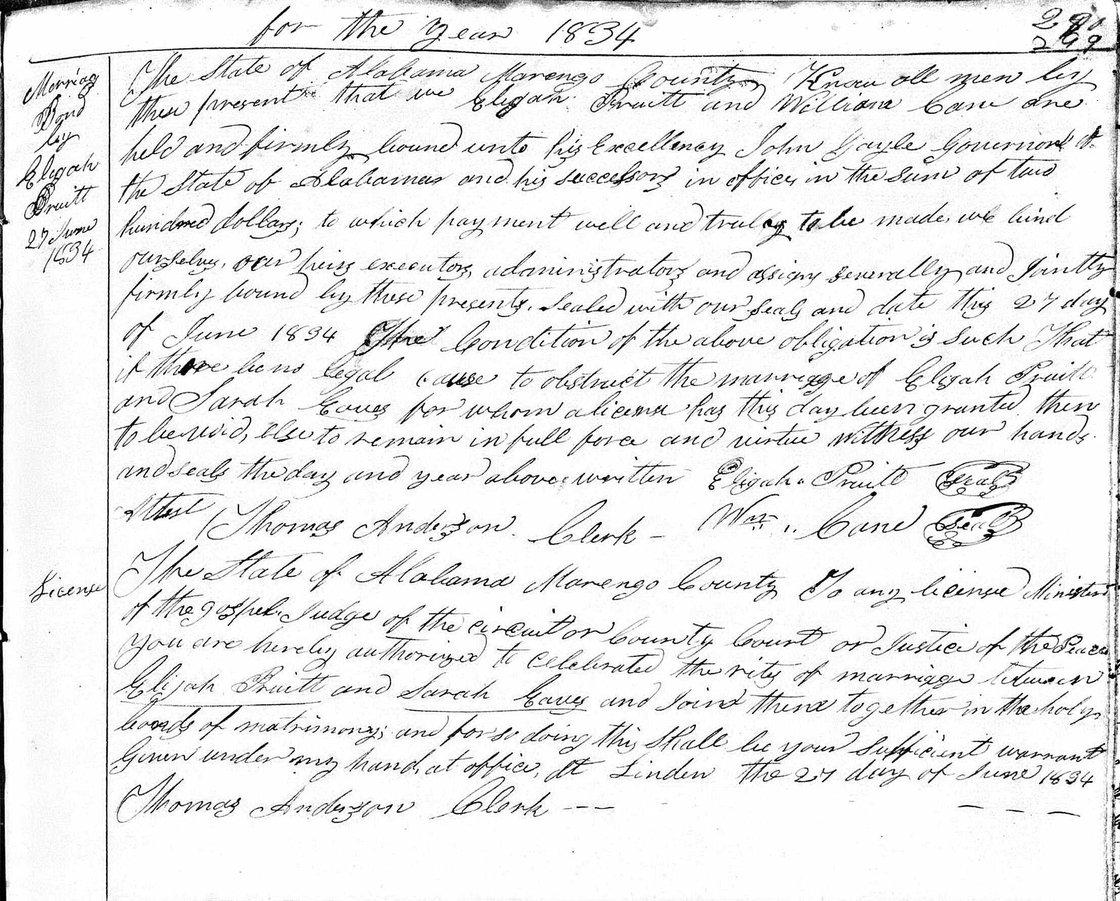 Alabama Marriage Record of Elijah Pruitt and Sara Eaves, 1834