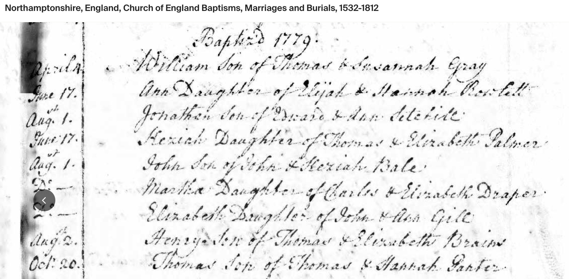 | Henry BRAINES | August 2, 1779 | 246 | Grafton Underwood, Northamptonshire, England | 0 | M | YES | YES | |||||||||